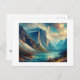 Uma paisagem de montanha majestosa é representada com penhascos torrenciais e um rio sereno refletindo as cores vibrantes do céu. As pinceladas criam um sentimento impressionista, captando a interação dinâmica entre luz e sombra.