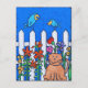 gata o gnomo do jardim conversando com alguns pássaros azuis.
