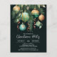 Elegant Christmas holiday party invitation postcards feature pine branches, green and gold Christmas ball ornaments and ribbons on a dark green background with your details in chic lettering, with room for your guest's address on the back, perfect for your festive holiday gathering. MATCHING items in our collection.