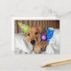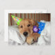 Já esteve cansado após um longo dia celebrando seu aniversário? Este cartão postal apresenta uma fotografia de um adorável cão golden retriever na cama, enquanto usa pijama e um chapéu de festa e segura seu ursinho de pelúcia. Hora de dormir!