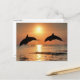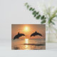 Um cartão de animais incrível mostrando dois golfinhos pulando no pôr do sol.
