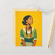 Um retrato estilizado de uma mulher enevoada com tons de pele profundos, adornada com joias circulares arrojadas e um vestido verde vibrante. O fundo amarelo minimalista melhora sua expressão serena e confiante, misturando arte moderna com elegância afrocêntrica.