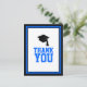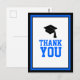 Escreva a sua obrigado que está com esta Festa de formatura Azul e Preta. Obrigado Cartão-postal. Ele apresenta 'Obrigado' em azul e um boné formando preto cercado por uma borda azul e preta. O verso é vazio para a sua mensagem pessoal.