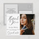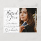 Um cartão postal de agradecimento de formatura moderno e sofisticado. A frente pode ser qualquer foto de graduação favorita com o texto THANK YOU, Turma de Info e Nome do Graduado. A parte traseira fornece um modelo de texto para mensagem genérica e espaço para mais. Altere a cor do fundo para o tema da escola ou para complementar a foto do graduado.