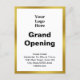 Front: A display image is at the top. You can replace the image with your logo. "Grand Opening" is in the center. Lines of black display text for your invitation message (i.e. you're invited, date, time, and address) are at the bottom. The front has a faux (not foil) gold border.