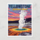A dramatic, retro-style travel poster illustration of Yellowstone National Park, focusing on the Grand Prismatic Spring or a geyser eruption. The image captures the vibrant, fiery colors of the mineral-rich pool, with a tall plume of white steam rising against a colorful sunset sky filled with pink, orange, and deep blue clouds. The text "Yellowstone National Park" is centered at the top.