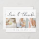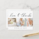 Um obrigado fotográfico moderno, que você postcard, desenhado para acomodar três das suas fotos favoritas de casamento em um formato quadrado alinhado lado a lado. "Amor e obrigados" aparece ao longo do topo na letra de sic manuscrito, com seus nomes embaixo. Cartões postais inversos para mostrar seu endereço de devolução com amplo espaço para endereçamento do destinatário, bem como uma mensagem pré-impressa opcional. Se você preferir adicionar uma mensagem manuscrita, simplesmente exclua o texto de exemplo mostrado.