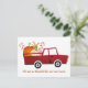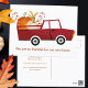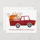 Um cartão postal de anúncio de mudança para o Dia de Ação de Graças fofo, apresentando um divertido caminhão vermelho que transporta abóboras de um campo de abóboras de outono. Temos uma nova casa neste outono com cores festivas vermelhas e laranjas. Um cartão postal de mudança de endereço para o feriado com classe.