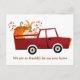 Um cartão postal de anúncio de mudança para o Dia de Ação de Graças fofo com um caminhão de fazenda vermelho divertido que está carregando abóboras de uma plantação de abóboras de outono. Temos uma nova casa neste outono com cores festivas vermelhas e laranjas. Um cartão postal de mudança de endereço para o feriado elegante.