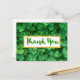 Um cartão postal com um novo design de primavera exibindo um campo de folhas de trevo em um verde natural exuberante. Obrigado escrito no centro em um quadro branco com uma borda de folha de ouro FAUX.