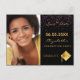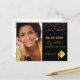 Uma foto Salve o cartão de data de uma festa de formatura. Na frente: adicione sua própria foto vertical do formando. Uma cor preta de fundo chic e um sprinkle confetti roxo. Modelos para um nome e data. Ouros. O nome e o texto: Salvar a Data são escritos com um script de estilo moderno com letra manual. Com um abstrato moderno boné de ouro falso, tassel topper. Voltar: detalhes da festa.