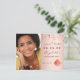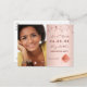 Uma foto Salve o cartão de data de uma festa de formatura. Na frente: adicione sua própria foto vertical do formando. Um fundo metálico de rosa, pincelado, decorado com estrelas. Personalize e adicione um nome e data. O nome e o texto: Salvar a Data são escritos com um script de estilo moderno com letra manual. Voltar: detalhes da festa.
