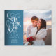 Esta elegante foto de script branco salve o cartão de data com sua foto especial e um script decorativo, salve a data acima de seus nomes, data e local. O inverso tem os detalhes adicionais da data, incluindo o site do casamento, com seu endereço de retorno e espaço para o endereço do destinatário. Projetado por Thisnotme©