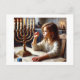 Uma jovem senta-se numa mesa, profundamente focada na menorah iluminada antes dela. A luz de vela suave ilumina a sala, criando uma atmosfera quente e íntima.
