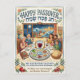 Celebrate the joy of Passover with this warm and whimsical folk art-style postcard that captures the heart of the holiday! The charming illustration features three generations of a Jewish family gathered around a seder table complete with a labeled seder plate, Haggadah, matzah basket, wine glasses, and candles. A magical window in the background depicts Moses parting the Red Sea under a moonlit sky, beautifully connecting the present celebration to the ancient story of Exodus. Hebrew text reads "Chag Pesach Sameach" alongside the English greeting, while the bottom message wishes a Pesach filled with "Joy, Freedom & New Beginnings." Framed with colorful folk-art florals, pomegranates, and olive branches, this postcard is a heartfelt and meaningful way to share Passover blessings with loved ones near and far.