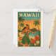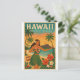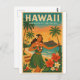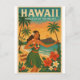 Travel poster of Hawaii, tropical island paradise. Golden sandy beach with turquoise ocean waves, tall palm trees swaying in the breeze, volcanic mountain silhouette in the background with a soft sunset glow. A traditional hula dancer with flower lei and grass skirt in the foreground, surrounded by vibrant hibiscus and plumeria flowers