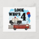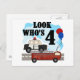 Um cruzador da polícia, motor de incêndio, balões e texto que diz "Olha quem é 4" aparece no nosso design de aniversário do Dia 4 de Heróis.
