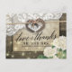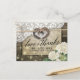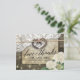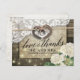 Modelos de Cartões de Agradecimento de Casamento em Estilo Rústico - Casal com Antiga Ferradura em Coração com Laço de Corda e Renda Branca, Flor de Hidrangea, Luzes de Corda e Tecido de Sarja em Fundo de Madeira de Celeiro Antigo.