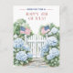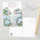 Linda cartão postal Feliz 4 de Julho com uma ilustração serena em aquarela de um portão de jardim branco emoldurado por hidrângeas azuis exuberantes e adornado com duas bandeiras americanas a acenar. O design elegante e o charme patriótico tornam-no uma forma sofisticada de compartilhar os seus votos de férias com amigos e familiares.