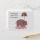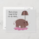 Um hipopótamo marrom giro em pé em uma poça de chuva rosa, um guarda-chuva marrom sombreado acima dele. Um dia chuvoso bonito dizendo...