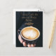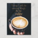 Uma foto de perto de uma mão segurando uma xícara de cappucino e uma citação de café "Hoje eu farei coisas incríveis. Mas primeiro, café"