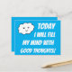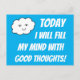 Que tal este adorável cartão postal azul aqua que diz: "HOJE EU VOU ENCHER MINHA MENTE COM BOAS PENSAÇÕES!" em letras grandes brancas abaixo de uma nuvem sorridente e muito feliz!
