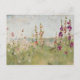 © Cheri Blum/Wild Apple. Hollyhocks perto do mar, junto com grama verde. Um céu azul pode ser visto no fundo.