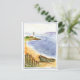 Esta engraçada aquarela é de uma cena de praia com seu barco a remo e seu farol no fundo com veleiros navegando pelo mar azul.