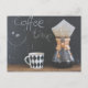 Um quadro atrás diz "tempo do café" com um smiley face, escrito em giz. Na frente, em uma mesa de madeira rústica, há uma caneca de café com um padrão de diamante design a preto e branco. Sentado ao lado da xícara de café está um pote de café com um filtro grande e um pote de café recém-fabricado. Parece rústico e antiquado.