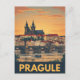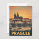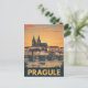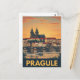 Este cartão em estilo retrô apresenta uma bela ilustração do horizonte de Praga ao pôr do sol. Ele mostra a majestosa Catedral de São Vito e a histórica Ponte Carlos, com um barco navegando ao longo do rio Vltava. As cores quentes da hora dourada e a tipografia retrô clássica lhe dão a sensação de um pôster de viagem atemporal. É uma escolha ideal para um bilhete das suas viagens ou um presente para um amante da história e da arquitetura.