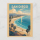 Design de viagem vetorial retrô de San Diego. San Diego, uma cidade costeira descontraída no sul da Califórnia, é conhecida por suas belas praias, zoológico de classe mundial e clima perfeito o ano todo.