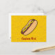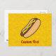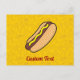 Ilustração de desenho animado de cachorro-quente. Fundo amarelo de comida de lixo sem costura. Custom Text.