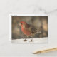 Este cartão-postal apresenta um martelo masculino na neve. Ele tem adorável plumagem vermelha na cabeça e no seio. A neve agarra-se ao bico. O fundo luminoso está em tons de ouro, cinza, laranja e branco.