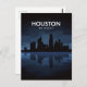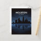A flat-vector illustration of the Houston skyline silhouetted against a dark, cloudy night sky, with a deep blue reflection shimmering on the water below.
