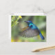 Cartão de animal mostrando um lindo beija-flor azul pairando néctar das flores. Os beija-flores são aves do Novo Mundo que constituem a família Trochilidae. Elas estão entre as menores aves. Eles são conhecidos como beija-flores por causa do som de beija-flores criado por suas asas batendo que batem em altas frequências audíveis para os humanos. Eles pairam no ar do médio a velocidades de flapping de asas rápidas, geralmente cerca de 50 vezes por segundo, mas possivelmente até 200 vezes por segundo. Os beija-flores têm o maior metabolismo de qualquer animal homeotérmico. Para conservar energia quando a comida é escassa, eles têm a habilidade de entrar em estado de hibernação.