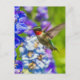 Um brilhante homem rubi atirado fotógrafos de beija-flor num jardim de verão com uma soma de larkspur.