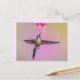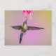 Cartão postal com o exótico beija-flor-flor-de-coleira-violeta em voo numa floresta nuvem no Equador, buscando uma flor cor-de-rosa de fúchsia, com suas asas estendidas e lindas penas longas de cauda em exposição. Cartão de beija-flor bonito e único para amantes de pássaros, natureza e jardim. Foto tirada em Tandayapa, Equador.