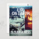 Cartaz com gráficos brancos e foto de Nova Orleans depois do furacão Katrina também com fogo selvagem queimado com "LIFE ON EARTH É TÃO MESS QUE ENCHE NOSSOS CORAÇÕES COM DOR E STRESS" com I-BONE LTD. Muitos são afetados por uma ganância tão extrema que faz com que usem mal o nosso planeta de uma forma muito abusiva. Em breve, a nossa casa terrestre será um lugar inabitável. Esta forma de ganância é um tipo raro de loucura.