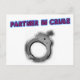 Perfeito para a outra metade de problemas! Esta design inclui um par de algemas trancadas cortadas ao meio, revelando o lado esquerdo com a frase "Partner In Crime", escrita acima em um sinal luminoso vermelho e azul de neon da sala de bar, inclinado para cima.