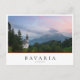 Cartaz fotográfico de nuvens coloridas no céu durante o pôr do sol sobre a igreja de Maria Gern, com vista à montanha de Watzmann, nos Alpes alemães, perto da fronteira com a Áustria, em Berchtesgaden, na Baviera, Alemanha, com uma borda branca e numa caixa branca o texto "Baviera, Alemanha". O cartão tem listras em preto, vermelho e amarelo, as cores da bandeira alemã.