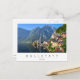 Cartão de foto magnética de uma paisagem com a igreja e as casas da pequena vila de Hallstatt na Áustria, com reflexo na água parada do lago Hallstatt e ao fundo as montanhas dos Alpes em um belo dia de verão de céu claro com uma borda branca e o texto 'Hallstatt, Áustria'.