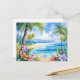 Envie um pedaço de paraíso com este cartão postal de praia tropical! Com palmeiras vibrantes, flores tropicais coloridas e uma vista serena do oceano, este trabalho de arte ao estilo aquarela captura a perfeita fuga da ilha. Ideal para guardas de férias, presentes de viagem ou adição de um toque ensolarado à sua correspondência.
