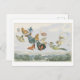 Este cartão postal é uma reprodução de uma ilustração de um antigo livro infantil que mostra uma rainha das fadas conduzindo uma carruagem pelo ar puxada por borboletas.
