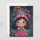 Este é um lindo design de aniversário ilustrado com uma garotinha fofa de olhos grandes, cabelos escuros, bochechas rosadas e um sorriso brilhante. Ela usa um chapéu listrado colorido com um pompom, combinando com o fundo animado e festivo repleto de bolhas flutuantes, estrelas e brilhos mágicos. A tipografia quente e desenhada à mão de "Feliz Aniversário Irmã" adiciona um toque divertido, complementando o tema de alegria e celebração. O presente embrulhado com um laço decorativo reforça o tema de aniversário, tornando este um cumprimento ideal.