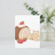 Uma ilustração fofa de um gato e de um pedaço de bolo de rolo de morango