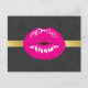 Um cartão postal com uma ilustração com lábios rosa-quente. Imagem brava e vibrante. Colocado sobre um fundo preto manchado. Uma faixa de gradiente dourado atrás da imagem.
