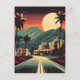 A imagem mostra uma ilustração estilizada de uma vista cênica de Hollywood. A paleta de cores é quente com uma vibração retrorreflectora, apresentando tons de laranja, vermelho, amarelo e lacre. No primeiro plano, há uma estrada que leva em direção ao horizonte, marcada com linhas brancas que sugerem desfoque de movimento, dando uma sensação de profundidade e movimento. O chão é uma palmeira, símbolo icônico de um clima quente e muitas vezes associado a destinos de férias. O centro mostra dois edifícios com características arquitetônicas que lembram estilos espanhóis ou mediterrânicos, como telhados de terracota, arcos e muros de reboco. No fundo, há montanhas rolantes sob um céu céu duplo, com o sol pendurado baixo e grande, lançando uma luz suave sobre a cena. A atmosfera geral da imagem é uma de uma fuga tranquila, exótica no pôr do sol. O trabalho de arte pode estar associado a viagem, lazer ou atração do paraíso.