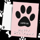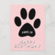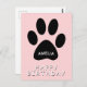 Cartão postal de aniversário com impressão de pata rosa fofo. Este cartão postal de aniversário para crianças apresenta uma impressão de pata de cachorro preto em um fundo rosa. Personalize o cartão postal com seu nome e você também pode alterar o texto de Feliz aniversário.