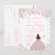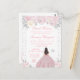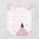 Este convite de aniversário de doze anos de inverno elegante e glamoroso apresenta uma bela princesa com cabelos castanhos e pele clara em um vestido de baile rosa. O texto combina caligrafia manuscrita e fontes modernas sem serifa para um visual sofisticado e elegante. As arranjos florais, flocos de neve e confetes prateados criam a combinação perfeita de rústico e chique.