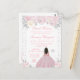 Este convite de aniversário de dezesseis anos de inverno elegante e glamoroso apresenta uma bela princesa com cabelos castanhos e pele morena em um vestido de baile rosa. O texto combina caligrafia manuscrita e fontes modernas sem serifa para um visual sofisticado e elegante. As arranjos florais, flocos de neve e confetes prateados criam a combinação perfeita de rústico e chique.